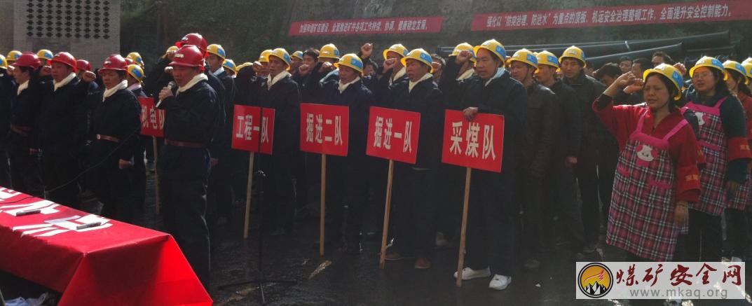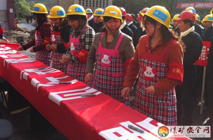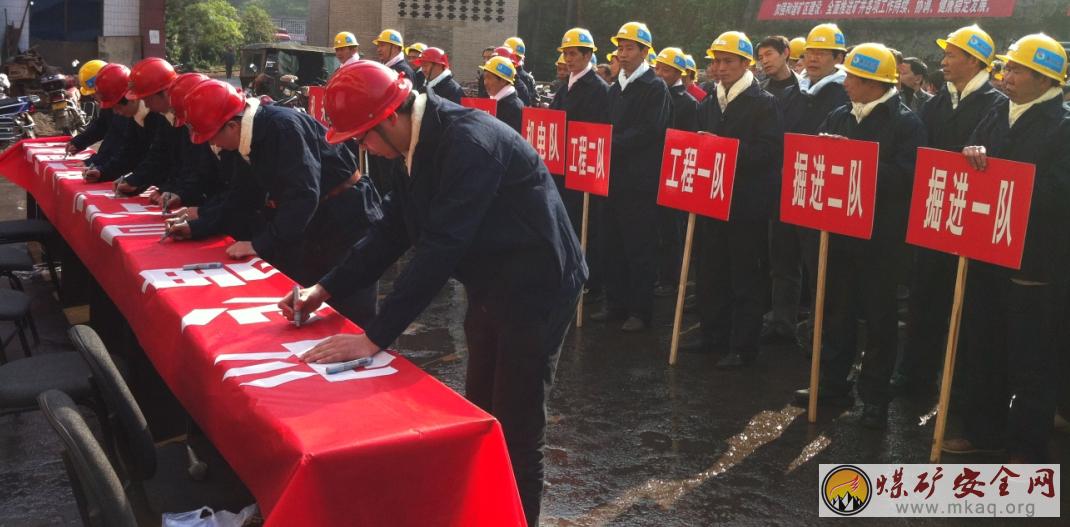 最後,公司各科室、井隊、家屬協管員在公司安全經理張宜林同誌的帶領下高舉右手,緊握拳頭,莊嚴宣誓。宣誓後,全礦職工在鍾德江同誌的帶領下分別在安全生產條幅上鄭重簽名。