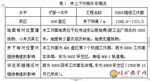 本巷道為5#406盤區8606工作麵5606回風順槽,地麵位於紅寺窪東山梁地帶,地麵有少量農田及林地,南臨406-1軌道巷,西為8606工作麵實體煤,東為8608采空區(2008年12月已采完)。