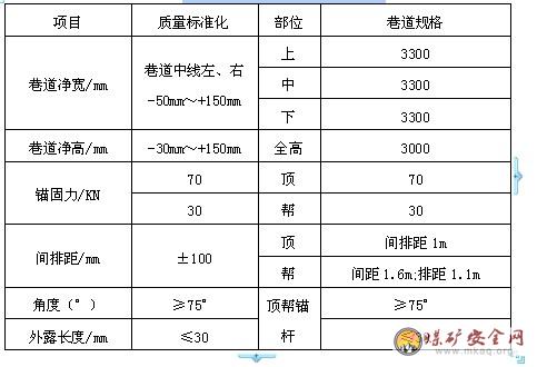 頂錨杆錨固力不小於70 KN,扭力矩不小於100N·m,幫錨杆錨固力不小於30 KN,扭力矩不小於60 N·m;錨索預緊力不小於120 KN,錨固力不小於230KN。
