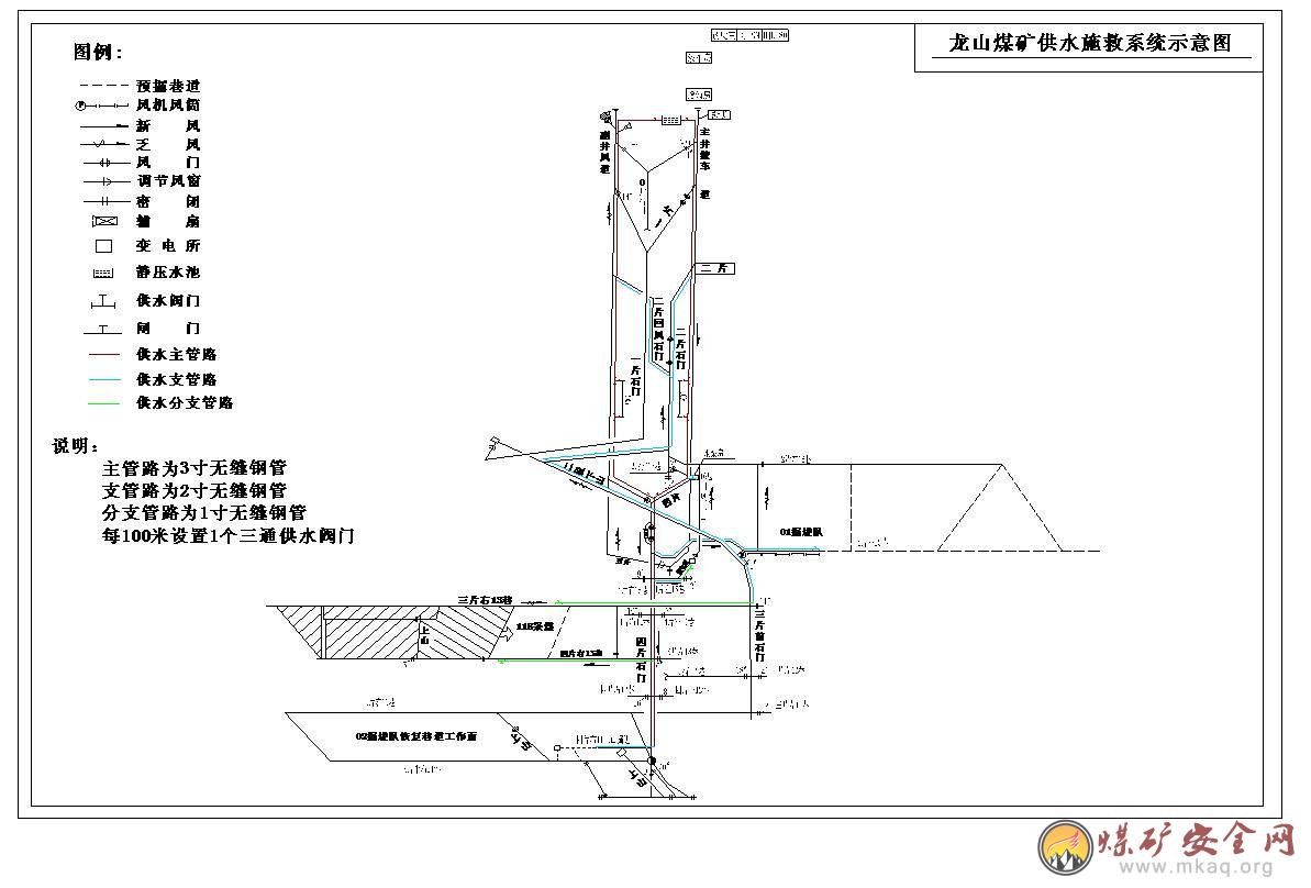 11、供水施救係統(消防、防塵):供水水源引自地麵消防靜壓水池,水池容量200m3,並有自來水隨時加水充填。主管路為Φ3寸無縫鋼管,支管路用Φ2寸無縫鋼管,分支管路用Φ1寸無縫鋼管接至迎頭。