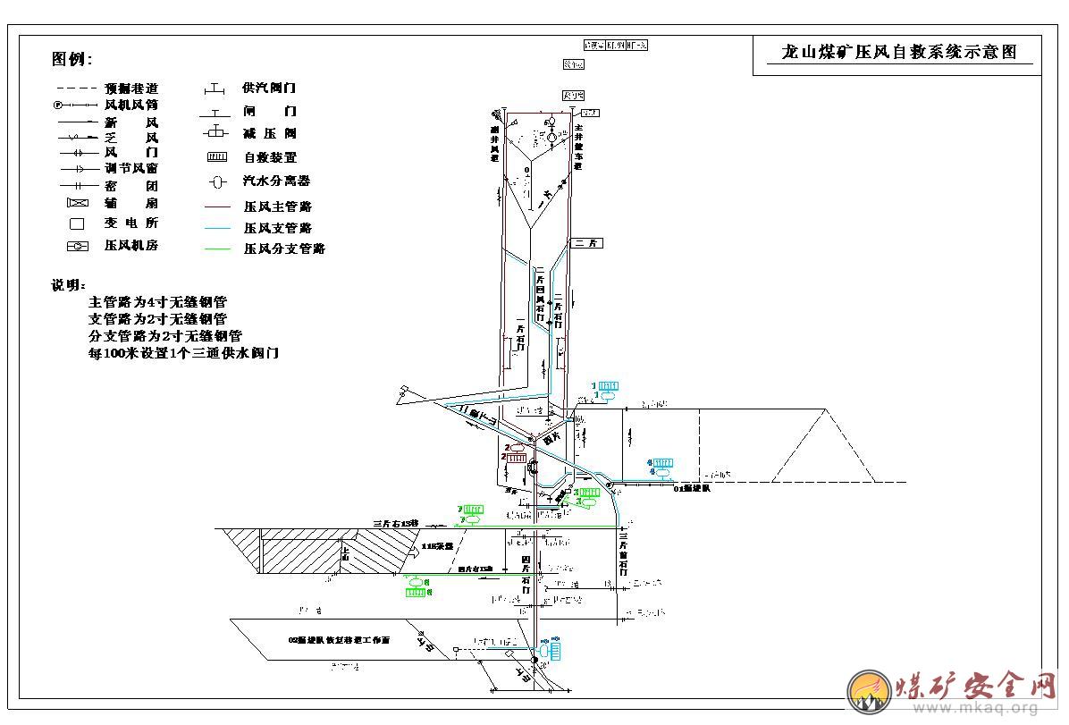 10、壓風自救係統:風源來自地麵壓風機房。地麵空壓機型號為:GA90-10型(2台),其中一台為備用。主管路為Φ4寸無縫鋼管,支管路、分支管路用Φ2寸無縫鋼管和1寸膠管沿路接至迎頭。迎頭風壓最小為0.4~0.6Mpa。