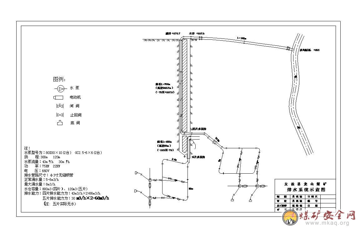 排水設備:在右四片井底水泵峒室設有2台80D30×10型水泵,揚程:300m,水泵流量:43m3/h,功率:75KW。一台工作,一台備用;井上一台檢修。兩躺3寸管路,集中排水。