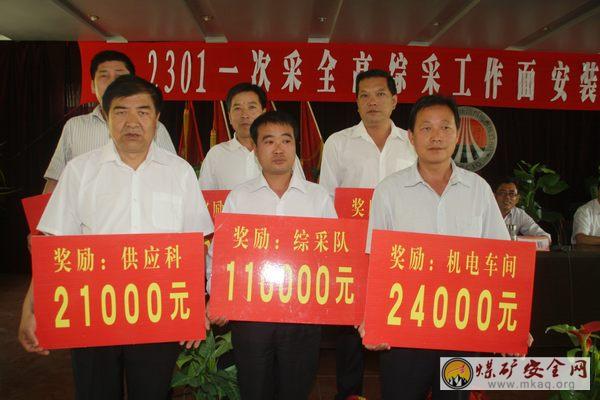 會議由該礦黨委副書記、工會主席苟勝利同誌主持。轟鳴的鞭炮聲伴隨著《咱們工人有力量》雄壯有力、催人奮進的樂曲聲拉開了大會的序幕。該礦副礦長白永筱同誌在會上做2301工作麵安裝工作總結報告。第一副礦長潘成忠同誌宣讀了關於對在2301工作麵安裝工作中表現突出的單位和個人進行表彰的決定。在歡快的樂曲聲中,該礦黨政領導為在此次2301工作麵安裝過程中表現突出的先進集體頒發了獎金。隨後,綜采隊隊長王留河、運輸區黨支部書記高金瑜、生產科主管副科長高永強分別代表參與此次工作麵安裝的單位和工程技術人員在會上發言,介紹了在此次2301工作麵安裝工作中超前思維、克服困難取得的先進經驗,表達了投身煤海、建功立業的信心和決心。
