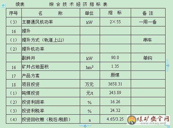 本礦井的開發可使本區的資源優勢轉化為經濟優勢,帶動地方經濟發展,具有較好的經濟效益和社會效益。礦井綜合技術經濟指標詳見附表。