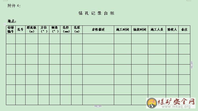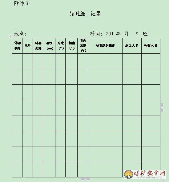 3.9施工單位、各業務部門、調度室必須建立鑽孔台帳,台帳內容包括地點、位置、孔號、方位、傾角、孔深、孔徑、鑽孔煤岩情況。