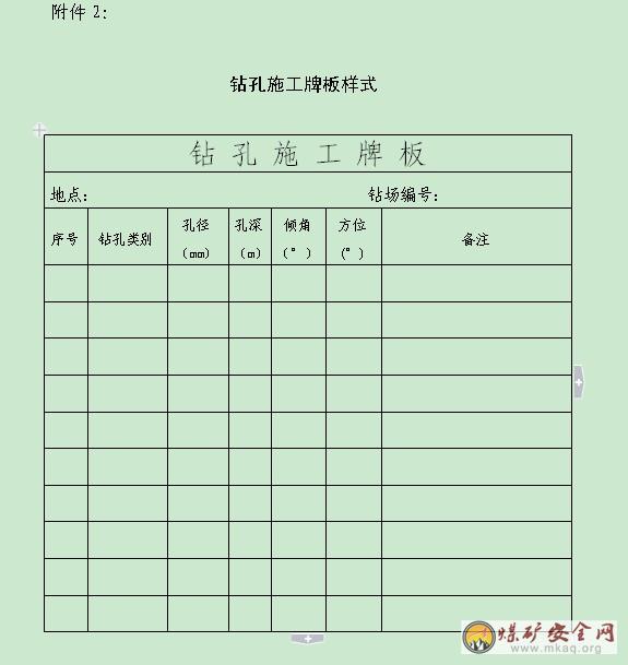 3.3鑽孔施工地點必須懸掛施工牌板。牌板內容包括地點、編號、孔號、鑽孔類別、孔徑、方位、傾角、孔深。