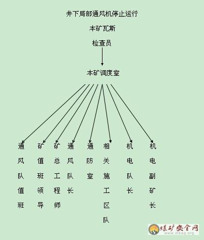 3、因停電引起局部通風機停風後,調度室通知瓦檢員或安全員立即撤出受停風影響區域的全部人員至進風巷道中待命,同時在停風巷道口打上柵欄,嚴禁人員進入,並同時告知分管隊長加強現場人員組織及安全管理。