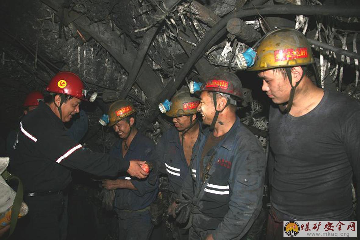 通訊員(宋根順)8月27日,冀中能源峰峰集團萬年礦一年一度對大型設備進行檢修,尤其是今年檢修任務隻有4天時間,在時間緊任務重情況下,礦工會為了促進檢修任務順利完成,帶著蘋果、鮮桃和飲料到井下二部皮帶車房、288工作麵看望員工進行慰問。員工們對礦工會送來的水果和飲料激動的說:“感謝礦工會的關懷,能在井下吃到新鮮水果還是第一次,我們一定不辜負企業的關懷和愛護,保證高質量按時完成檢修任務,確保我礦2012年實現安全生產經營奮鬥目標做出自己積極貢獻。”圖為礦工會副主席桑金文(左)在給13288工作麵檢修的員工發放水果時的情景。