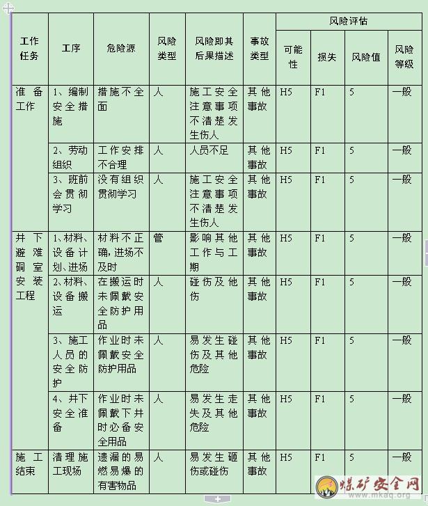 井下避難硐室安裝施工危險源辨識及風險評估: