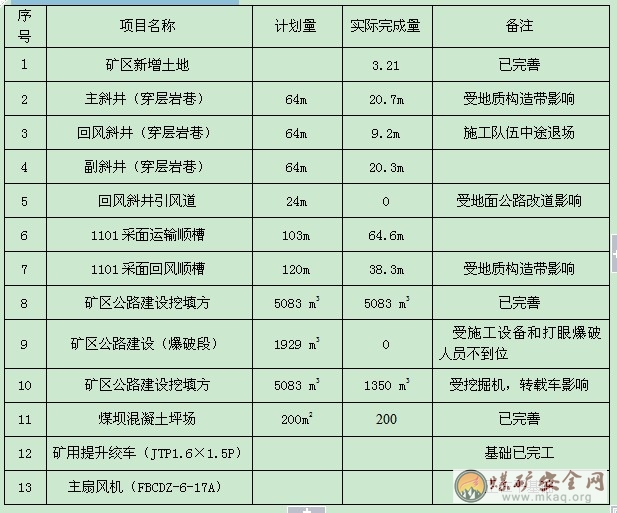 7、1101采煤工作麵運輸順槽:設計巷道長度560m,因為了提前形成礦井負壓通風,解決井下掘進工作麵通風困難,盡快達到聯合試運行的要求等原因,更改了巷道施工方案,提前布置1102接替工作麵部分運輸巷道,該段巷道長度目前剩餘工程量90.9m,預計6月6完成施工。