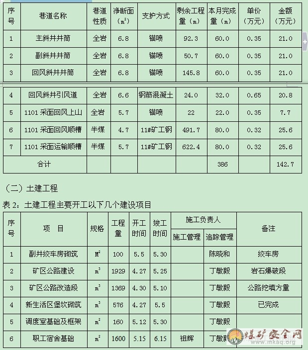 (一)井筒(全岩巷):總工程量312.8m,主斜井6月中旬落平,副斜井5月底落平,回風斜井貫穿需8月底。