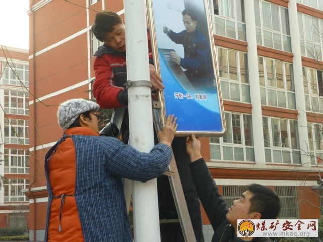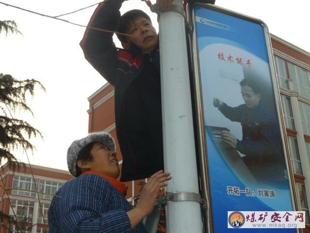 為進一步激發職工幹勁,新年再創佳績,濟寧唐口煤業公司對近期湧現出的工作突出、技能顯著的10類先進個人予以表彰,並為部分先進個人製作了宣傳標牌,懸掛在礦區太陽能燈杆上。圖為3月12日標牌懸掛現場。(張寶童)