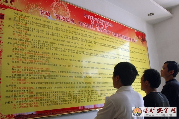 為進一步貫徹落實“解放思想,轉變作風,挖潛增收”主題教育活動,近日,攀煤公司花山礦利用宣傳欄、黑板報、張貼宣傳標語等形式,多角度、全方位的宣傳各單位活動開展情況,充分發揮宣傳在活動中的輿論引導作用。
