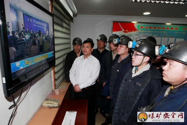 (圖為:采煤一工區幹部職工中班班前會觀看災情電視直播)