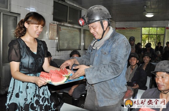 連日來,礦家屬協管會成員及女工誌願者們利用早上七點至八點,中午一點至三點半職工上、下井的高峰時間,將切好的西瓜端到職工麵前。在下井等候室,女工及家屬協管們,在給職工送上西瓜的同時叮囑下井的一線職工要安心工作,牢記安全,平安升井。在主井口,女工及家屬協管們手捧西瓜,用笑臉迎接走出罐籠的工友們,一句句“辛苦了”為他們帶來了清涼,驅走了疲憊。