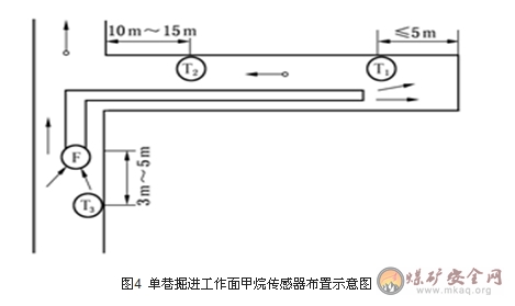 T1—掘進工作麵甲烷傳感器,設置在距掘進迎頭不大於5m的範圍內。T2—掘進工作麵回風流甲烷傳感器。T1、T2報警濃度≥0.8%CH4,T1、T2斷電濃度≥1.2%CH4, T1、T2複電濃度<0.8%CH4,T1、T2斷電範圍:掘進巷工作麵及其回風流內全部非本質安全型電氣設備。T3—雙巷回風流混合處甲烷傳感器,其報警濃度≥1.2%CH4, T3斷電濃度≥1.2%CH4, T3複電濃度<0.8%CH4, T3斷電範圍:包括局部通風機在內的雙巷內全部非本質安全型電氣設備。