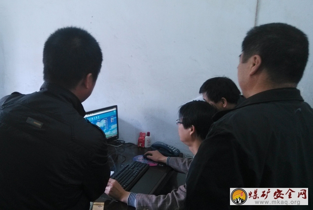 (圖為該礦安監處人員在機電科耐心為隊幹部講解綜合信息調度管理平台操作知識。)