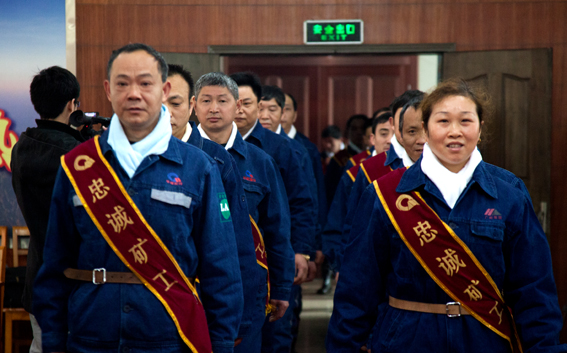 在表彰會現場,26名忠誠礦工佩戴綬帶、紅花,踩著紅地毯步入會場,與會人員全體起立向他們致敬。礦領導向忠誠礦工發放了證書、獎杯和2000-5000元不等的年度榮譽重獎。礦黨委負責人還引用關雲長千裏走單騎、嶽飛精忠報國、諸葛亮鞠躬盡瘁死而後已等曆史經典闡述了弘揚、傳承忠誠對企業發展、人格塑造的重要性,告訴大家:曆史銘記忠誠,時代呼喚忠誠,企業離不開忠誠的隊伍。