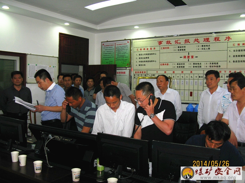 14時58分,在礦領導周鴻淩、楊長勤、杜紅軍、李士祥、盛振強、曹衛中、祁杭春、呂為兵等接到汛情通知後,第一時間趕到了調度室。礦長、防洪總指揮楊長勤聽了調度員對汛情的彙報後,立即下達防洪演習指令,隨即防洪演練開始。
