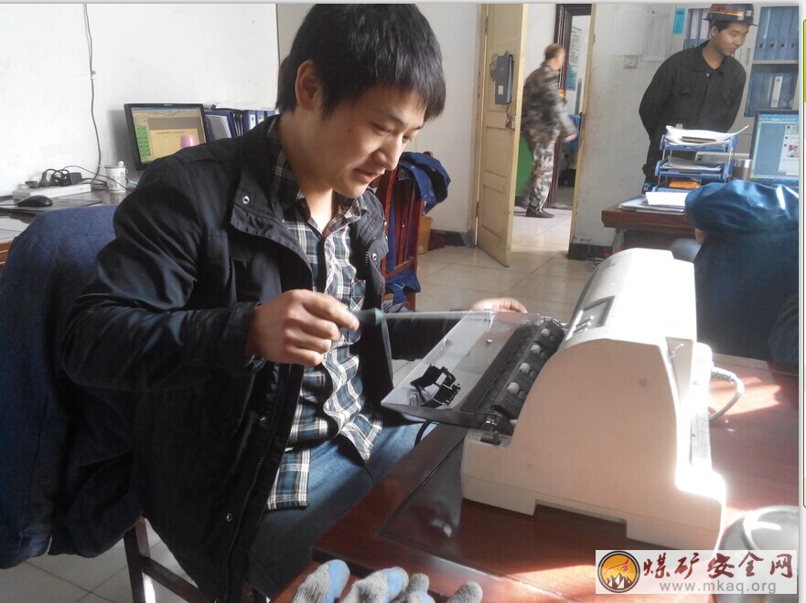 6月12日,眾維煤業供應係統出庫單打印機突然不工作了,一邊是區隊等著打票領料,一邊是離縣城100多裏的路程。麵對這兩難困境,供應係統主管陳嘉將另外一台已報廢的打印機拿出,放在一起自己動手修了起來,隻見他一會這看看,一會那拆拆。一會查查資料,一會調試調試。還沒有一個小時的功夫,打印機就“吱、吱、吱、吱”的又叫了起來。