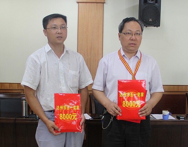 7月29日,在達竹公司召開的十二屆六次職代會聯席會上,公司對2014年和2013年度達州市“五一”勞動獎章獲得者頒發了獎章和獎金。紀委書記、工會主席朱世貴為獲獎人員頒獎。