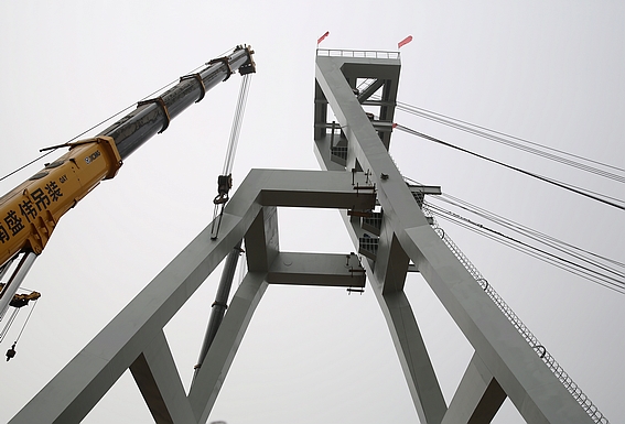 為保證吊裝安全,他們采用2台400噸級吊車、2台70噸級吊車與2台20噸級穩車相互配合的施工措施,並采取專人開車、專人排繩、專人監護的方式進行牽引。經過緊張有序的起吊安裝,8月5日中午11點半,該套井架的主副斜架順利實現合攏,穩穩地矗立於井架地基上。