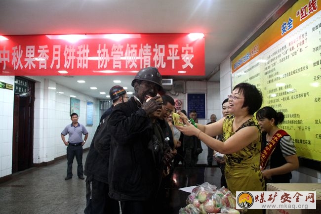 中午2點多鍾,家屬協管員們還在井口為出入井職工演唱了一首首祝福平安的歌曲,給礦山的節日增添了無限喜慶氛圍。據統計,中秋節,該礦協管員們共為礦工發放月餅、平果、香鹽蛋等各1800餘個。