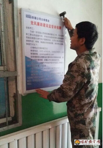 為了響應集團公司黨風廉政建設精神不折不扣落到實處,充分發揮群眾舉報監督在加強黨風廉政建設起到的決定作用。2014年9月22日新疆公司眾維煤業紀檢監察科成員在宿舍樓一樓大廳和職工食堂醒目處吊掛了黨風廉政建設監督舉報牌,此牌板上標有舉報電話和舉報郵箱。它的設立為眾維煤業廣大領導幹部和黨員在加強黨風廉政建設方麵關於充分發揮群眾監督起到了重要作用。