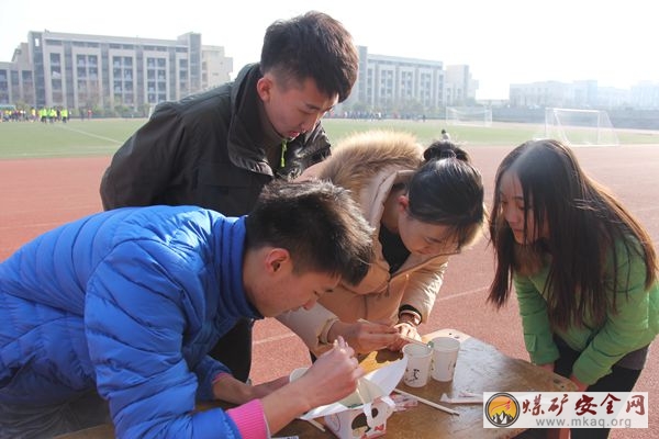 活動中,小組4人互相協作,完成了:吹氣球並背靠背把氣球擠破、在原地轉十圈後喊出東西南北任意方向、單腳站到一張A4紙上堅持三十秒、一名隊員口含水向另一名隊員傳達工作人員所出示的詞語、將針線穿起來、將彈珠用筷子夾到旁邊的容器中、用左手寫下“我愛礦大,我愛礦業學院”、完成十個蹲起、五個俯臥撐、五個仰臥起坐、二十次跳繩。整個活動參賽者邊跑邊完成任務,大家了樂在其中。