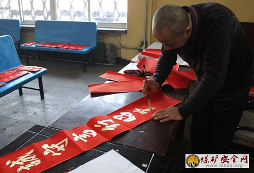 春節將至,陽煤五礦掘開工區團總支請書法好的人書寫“核心價值觀”對聯,在宣傳和推廣“社會主義核心價值觀”的同時,增加節日的喜慶氣氛。