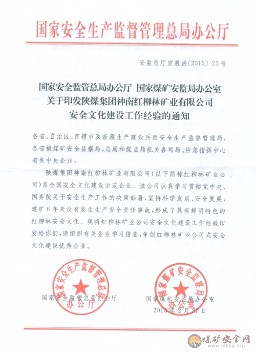 近年來,陝煤化集團神南紅柳林礦業公司以“打造世界級標杆企業”為願景目標,以“心·Xin”文化為引領,以過程控製精細化管理為抓手,以心為本,從心出發,始終把員工的健康和安全放在首位,把人作為安全管理工作的核心,建立了“挽手貼心”安全文化,通過理念引領、全員參與、過程控製、精細管理,取得了驕人的業績,截止3月底,該公司實現連續安全生產2175天。先後榮獲國家級安全質量標準化煤礦、全國企業文化優秀案例、“心·Xin”文化品牌礦、全國安全文化建設示範企業等多項榮譽,日前,國家安全生產監督管理總局已發文,向全國推廣紅柳林礦業公司安全文化的先進做法。