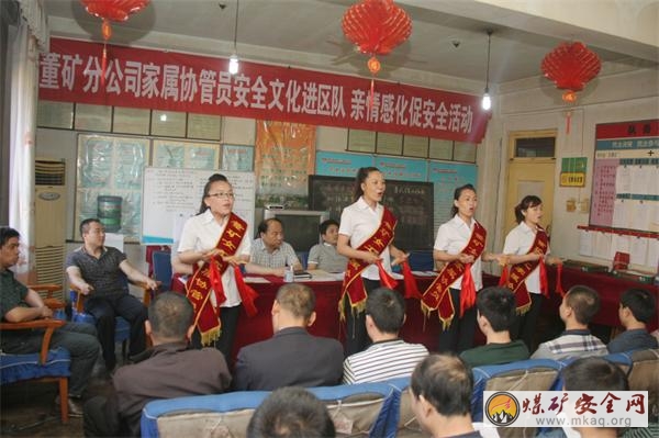 近日,董礦分公司工會女工委組織家屬協管員深入采掘、輔助生產13個區隊,開展“安全文化進區隊,親情感化促安全”活動,利用區隊班前會宣讀安全“家書”,表演安全快板,把關愛和安全囑托傳遞到一線職工手中,讓他們感受到來自組織和親人的深情厚誼。自覺做好自保、互保、聯保,安全生產,為實現公司安全生產目標做出自己的貢獻。