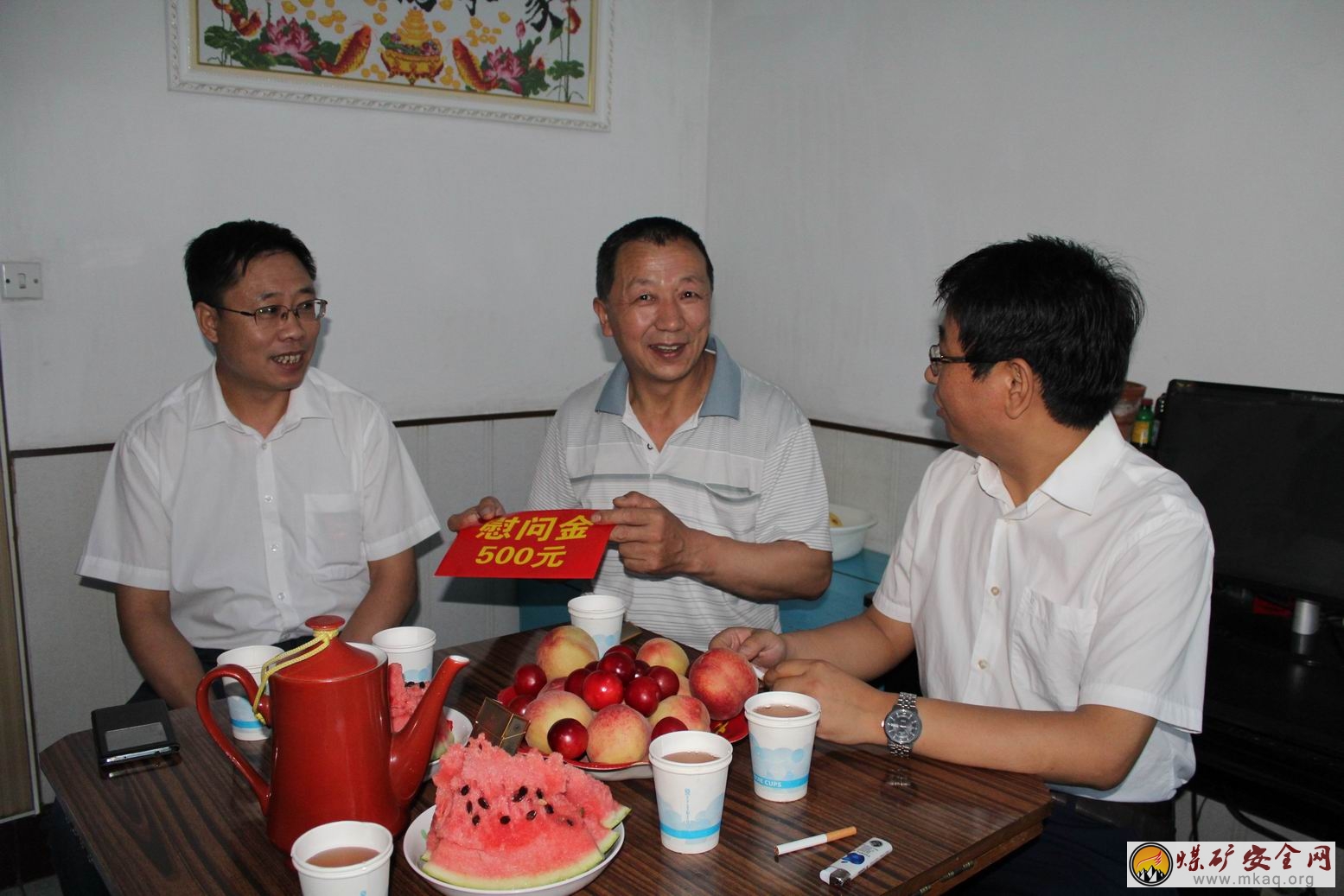 在迎接建黨94周年之際,6月25日,礦黨委委員、副礦長原建軍在政工部及采煤工區相關負責人陪同下,帶著黨的溫暖和企業的關愛對困難黨員王彥珍進行慰問,送去500元的慰問金,並送去了大米、白麵等慰問品。