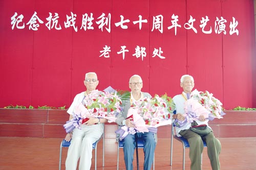 本報訊 記者陶金攝影報道 近日,集團公司老幹部處專門邀請張泉、薜誌一、於廣利3位抗戰老兵代表現場觀看了紀念抗戰勝利70周年文藝演出,並為他們頒發了紀念章,送上了慰問金。