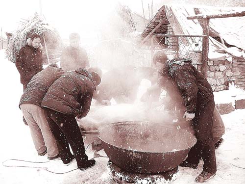 酒瓶已經鍋炸裏了,誰也沒辦法把酒撈出來,怎麼辦?盼了一年的殺豬菜還怎麼吃?來了這麼些客人,可怎麼辦呀?一連串的怎麼辦,讓我頭疼不已。這時候就得我說話了:“把瓶碴子撈出來,別出傷人02manbetx.com ,加大火,使勁燒,讓酒氣往外跑一跑,再去弄幾斤散‘大淩川’,別吱聲!”我當時想,酸菜燉肉、血腸上桌,酒滿滿地倒上了,隻要大家喝上了,誰還介意菜裏有沒有酒。