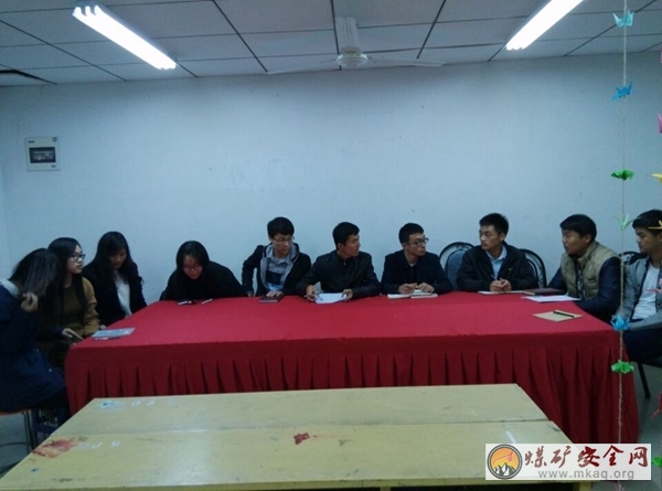 晚上9:00,礦業學院14級團總支在梅苑三號樓心靈小屋教室召開換屆大會。礦業學院14級兼職輔導員馬鵬,輔導員助理康誌鵬及14級各班團支書參加此次換屆大會。