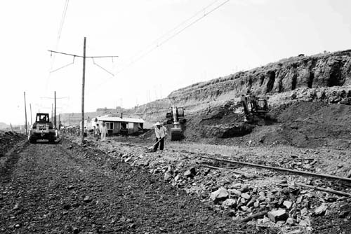 “清”現場。水災過後,坑下東部32站部分鐵道線路受損,沉積了大量碎石、淤泥。27日一早,礦黨政組織工務段開展清淤自救,安排全礦各車間和礦機關抽調人員趕赴現場協助。鐵道線路內的碎石、淤泥相當難以清理。直接動用機械設備就會損毀軌排,員工們隻有用鐵鍬一點一點的清理,鐵鍬伸不進去,大家就用手一點一點的往外扒。暴雨過後,火熱的太陽使得坑下溫度不斷上升,員工們在接近40度的高溫下作業大汗淋漓,汗水浸濕的工作服被體溫熥幹了一遍又一遍。挖溝機、推土機的轟鳴聲始終響徹在現場。