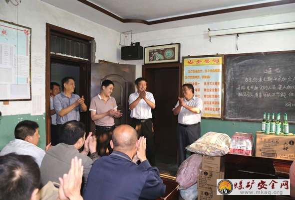 通訊員(宋根順 )近日,峰峰集團萬年礦工會到綜掘一區送去了白糖、花露水、毛巾等防暑降溫用品,囑咐職工休息好,搞好安全生產,受到一線職工的歡迎。圖為礦工會到綜掘一區送清涼現場。