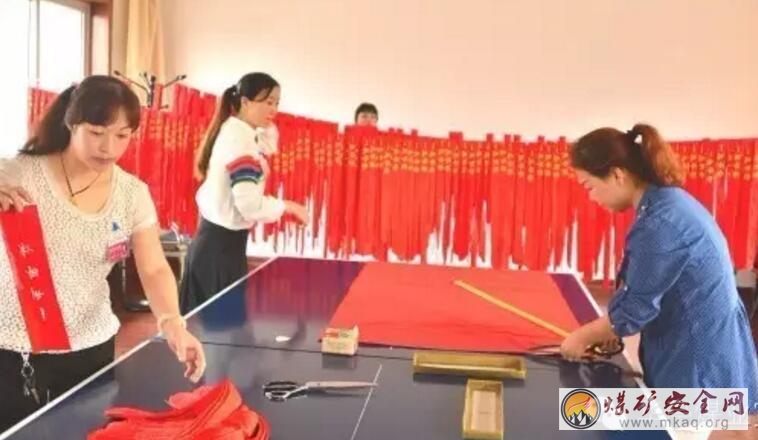東峽煤礦家屬協管員為一線職工縫製紅腰帶。今年以來,東峽煤礦工會緊緊圍繞礦井安全生產,開展了“協管安全我們在行動”係列主題活動,累計為一線職工縫補工作服1600件,製作安全紅腰帶866條,鞋墊280多雙。 白銀寶 攝