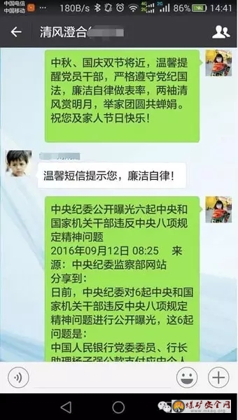“互聯網+”讓廉潔教育無處不在。“中秋、國慶雙節將近,溫馨提醒黨員幹部,嚴格遵守黨紀國法,廉潔自律做表率,兩袖清風賞明月,舉家團圓共蟬娟。祝您及家人節日快樂”!近日,澄合礦業公司黨員幹部都收到了這樣一條廉潔微信,提醒每一個黨員幹部過一個廉潔自律的節日。為了進一步加強黨員幹部廉潔自覺意識,該公司紀委不斷加大黨風廉政宣傳教育力度,利用黨風建設信息平台受眾麵廣、傳播速度快的優勢,在重要節點、重要時段為黨員幹部發送廉潔視頻、微信、短信,著力打造了廉潔教育常態化新平台。通過一條小小的微信,向公司黨員幹部送去了溫馨祝福和善意提醒,促使他們在重要節點注重作風建設,嚴格執行公司各項規定,營造礦區風清氣正的濃厚氛圍。