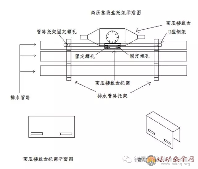 在排水管路托架上固定一根U型鋼架,將高壓接線盒托架卡在U型鋼架上,將高壓接線盒上的固定孔與高壓接線盒托架上的固定孔對齊,然後用螺栓固定可靠即可。也可以先將高壓接線盒托架與高壓接線盒固定好,然後再將高壓接線盒托架卡在U型鋼架上即可。