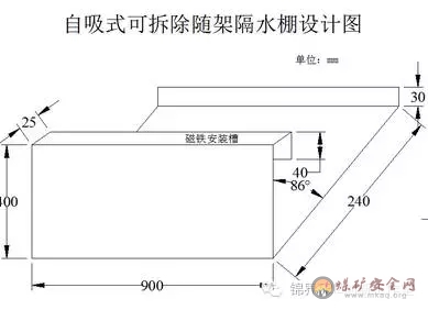 利用磁鐵將鐵皮製作的隔水棚,固定於綜采工作麵支架側護板的間隙內,利用隔水棚同支架角度,將淋水導流至大腳前,為行人通道提供保護。每個隔水棚使用兩塊長150*寬100*厚25mm的超強吸力磁鐵與支架固定連接。