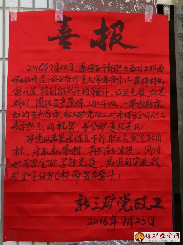喜報,喜報!2016年9月22日,新三礦采煤區攻堅克難、眾誌成城,創單日煤炭產量下半年以來最高水平,一舉扭轉了我礦被動的生產局麵。因此,新三礦決定對當班職工進行通報表揚,礦黨委副書記、工會主席李明國代表礦黨政宣讀了表揚信,采煤區區長當場拿出500元現金獎勵當班職工。