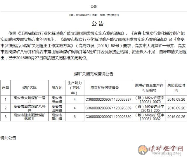 近日,小編從相關部門獲悉,依照省、市煤炭行業化解過程產能實現脫困發展等通知、方案的要求,我市轄區高安市大坑煤礦一號井、高安市泗崗煤礦八號井和高安市建山穎新煤礦楓順井等3處煤礦礦井,因資源接近枯竭,自願申請關閉退出,並於9月27日前按照關閉標準已經關閉到位。