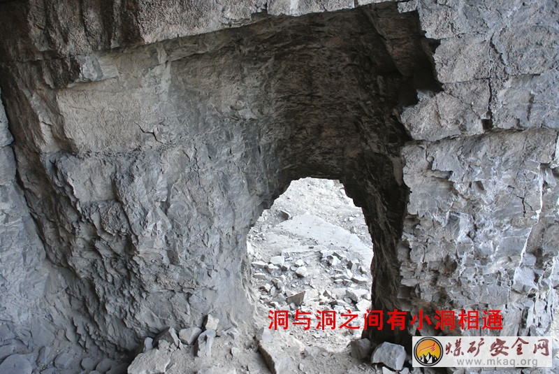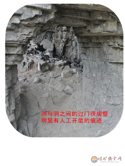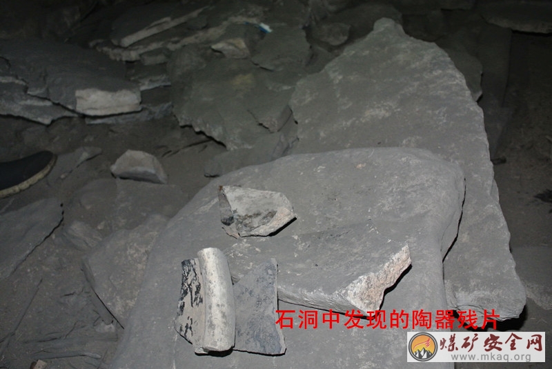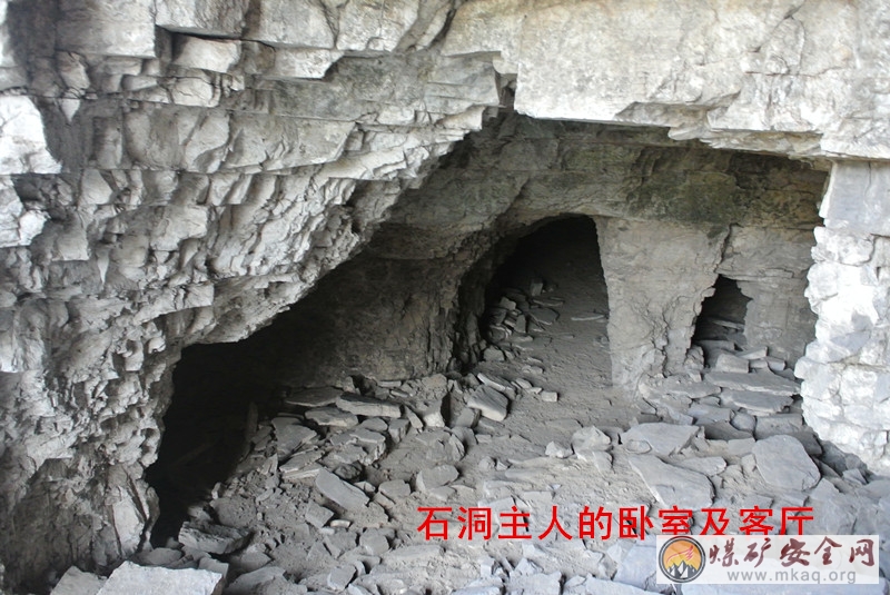 抱著一絲惋惜的心情,我們開始仔細地審視、考察這個山洞。山洞共分一大一小一進兩院。石洞緊貼絕壁,成一字排開,沒門沒窗,兩個石洞隔牆間有小洞相通。大一點的石洞大約有30多平米,內分9個套間(小洞),洞內大洞套小洞,洞洞相通,客廳、臥室、廚房,一應俱全,分布貌似簡陋卻布局合理。在石洞左側一個較大的“套間”裏,大大小小的石板呈直線排列,似乎是一盤大炕的炕沿。據估計,這裏應該是該家族主人夫妻的臥室。該房間的對側,有一個更大一點的“套間”,兩個凹進的洞底被柴火熏得黝黑,洞頂則是煙火熏得發紅的痕跡。“套間”另一角,可見一片呈圓形分布的石板群,據估計這裏是一座灶台,放鍋灶、案板、碗筷的地方。在這裏,我們發現了幾個陶缸、陶盔抑或是陶罐的殘片。老王把它們撿拾在一起,我趕緊進行了拍照。時過境遷,盡管灶台早已被廢棄,但不難想像曾經的嫋嫋炊煙,還有灶台上的山珍野味。在這張照片上,我發現有一些細長的或直或彎的針、梭、棒狀物。當時由於隻顧得觀賞和拍攝,再加上出於保護遺跡現場原貌的考慮,我們盡量沒有在現場動手翻看,以致於竟沒有注意到這些東西。如果這些東西,是石質的或骨質的,那將是一個震驚世界的考古發現。這兩個套間之間,地勢較開闊,可能是全家人聚餐的場所,並兼做客廳之用。其它幾個小“套間”,應該是家族其他成員如老人、已結婚的兒子兒媳、長大成人的子女等的臥室。更令我們拍案叫絕的是,這個石洞的最深處,竟有一條呈“S”狀人工開鑿的過道,大約七八米長,寬可容一個成年人從容進出,高約平均一米五左右,向南直通洞外。我倆03manbetx 認為,這個過道,既是整個居室通向“陽台”的“後門”,又是空氣流通的“天窗”,更是廚房的“煙囪”。試想,如果沒有這個過道,這個家族一日三餐生火做飯和冬季生火取暖產生的濃煙從那裏排出?如果沒有這個過道,這個家族的大小人等如何能經受得起長年累月的煙熏火燎?我想,在古代沒有任何機械設備配合的惡劣條件下,僅憑著一錘一鑿之力,靠人工在岩層中開鑿這樣一條過道,絕非一朝一夕所能做到的。如此龐大的岩石隧道開鑿工程,憑一般農戶人家的經濟實力要完成它,實在是難以想象的。一定是經過該家族幾代人堅持不懈、持之以恒的努力才完成的。不然,家裏一日三餐生火做飯排出的濃煙如何處理呢?這畢竟是危及全家人生命健康的頭等大事啊!按照現代人的看法,爐灶的煙囪是應該向上垂直矗立的。然而,在生產工具極其原始落後的古代,向懸崖頂端開鑿一個垂直上下的“天窗”(煙囪),完全是不可能的。所以,這個家族定居此地初年的第一代當家人,才退而求其次,效仿“愚公移山”的做法,跨數百年時間,動用舉族數代人之力開鑿了這條過道作為通風口。