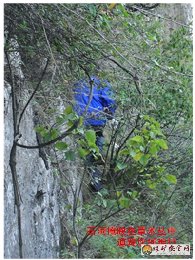 把摩托停在山腳公路旁一開闊處,筆者緊緊跟隨老王開始登山。可能是幾年前人們在山上打礦或者采石的原因吧,盡管雜草叢生,但起初的一段路徑還是比較寬闊、平坦的,可容一輛農用三輪車通過。登上一段緩坡,山體逐漸變得陡峭,坡度最少達70度之上,灌木叢也更加茂密,不過還有一條人開辟出來的小路,盡管小路很狹窄,旁生斜出的樹枝時不時拂麵而來,給人一種火辣辣生痛的感覺,但對我和老王兩個從小在山裏長大的人看來,借用一句流行語,那就是“天空飄來五個字,那都不是事”。很快,在茂密的叢林中,一塊水缸殘片進入了我們的視野。“到了,山洞就在這上麵。”老王肯定地說。於是,我倆不再沿小路前行,而是回過頭直線向上攀登。此時已經無路可走,由於山勢陡峭,樹木茂密,我倆借助樹枝,一步三滑,小心翼翼地向上攀登,很快就氣喘籲籲,汗流浹背,一路沿河前來被深秋涼風侵襲的寒意一瞬間便消失殆盡。