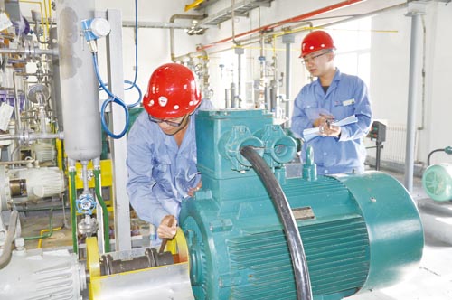 員工正在為機泵盤車時的情景。