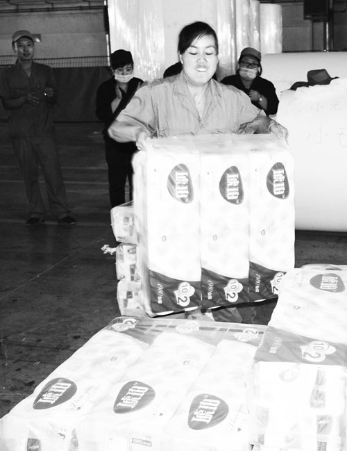 圖為參賽員工正在進行成品紙碼放時的情景。