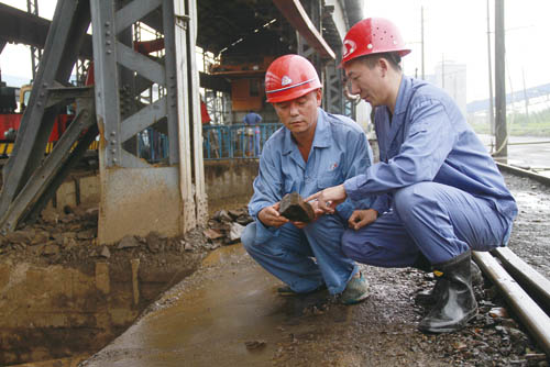 圖為翻車崗位員工正在03manbetx 頁岩品質時的情景。
