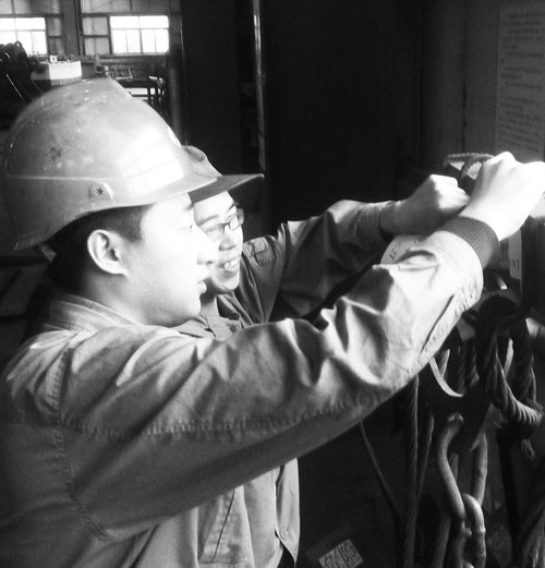 圖為檢查人員正在粘貼吊繩、吊具承重標識時的情景。